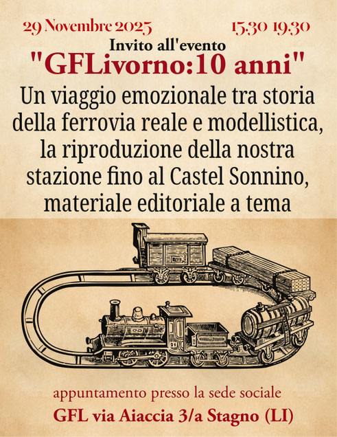 ti aspettiamo sabato 29 novembre dalle ore 15.30 presso la nostra sede in via Aiaccia 3/A. Avrai la possibilità di far girare sui nostri plastici, una tua locomotiva sia digitale che analogica, potrai ammirare alcuni nostri modelli correre sul plastico della Litoranea, potrai curiosare tra i tanti cimeli ferroviari che compongono il nostro personalissimo museo, ritirare una copia omaggio di una rivista di modellismo e ferrovia ed infine brindare con noi per il nostro compleanno.